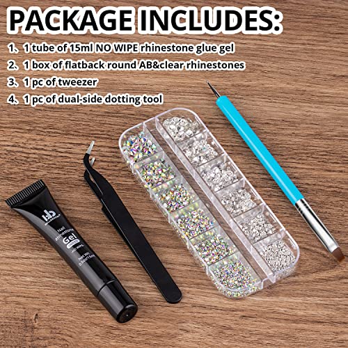 💎WHAT WILL YOU RECEIVE: The package comes with 1 tube of 15ml NO WIPE nail rhinestone gel glue; 1 box of 2-5mm flat back round glass AB&clear rhinestones; 1 pc of tweezer and 1 pc of double side dotting and brush tool.