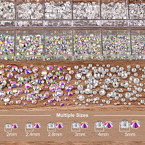 💎MULTIPLE SIZES: This set provides 1 box of Flat-back round glass crystal AB&clear rhinestones with 6 sizes: 2mm、2.4mm、2.8mm、3mm、4mm、5mm; Great size range for your nail art decoration!