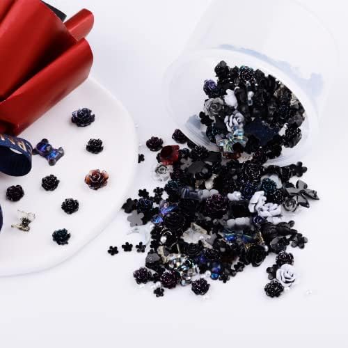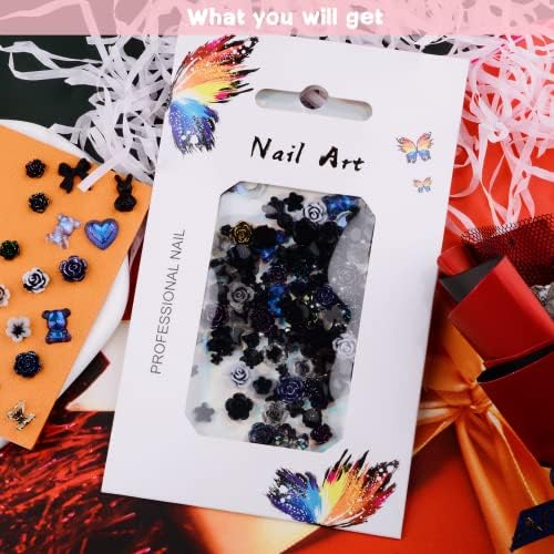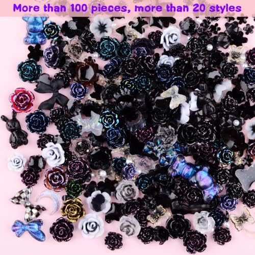 100 Pieces 3D Resin Butterfly Bear Nail Charms Rose Flower Peach Skirt Bow Deer Snake Rabbit Animal Shaped Nail Art Rhinestones Pearls for DIY Nail Art Decoration Making Craft (Black)