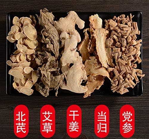 5味中药;当归,党参,北芪,艾草,老姜。艾草和老姜可祛除寒湿,当归,党参,北芪可活血补气