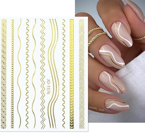 12 Sheets Gold Nail Stickers Gold Line Nail Decals 3D Self Adhesive Metal Geometric Stripe Wave Nail Sticker Gold Nail Art Designs Nail Art Supplies for Women Manicure Decorations