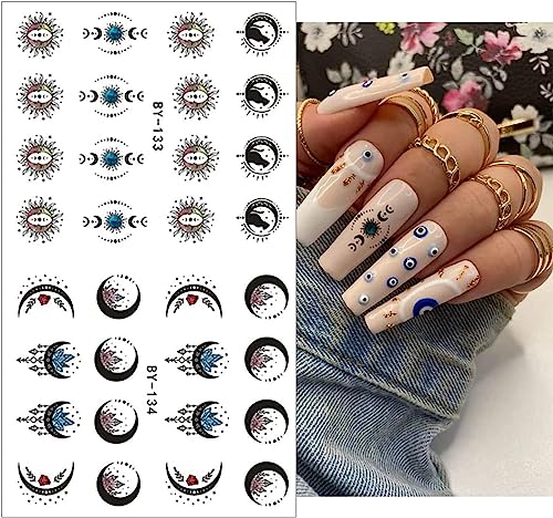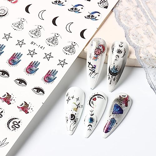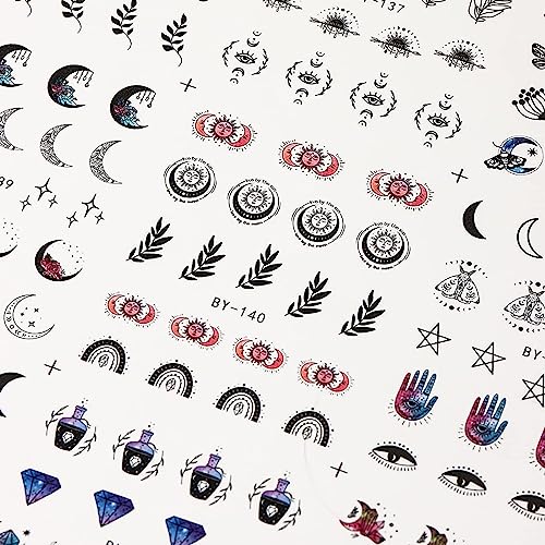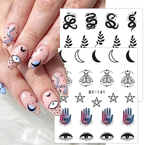 12 Sheets Moon Stars Nail Art Stickers Water Transfer Slider Nail Decals Sun Eyes Snakes Black Art Design Sticker Nail Art Decorations Supplies Acrylic Nail Stickers for Women Girls Nail Art DIY