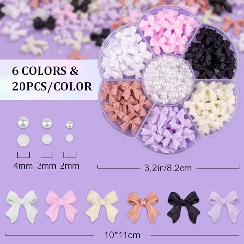 120 Pcs 3D Nail Bow Charms + 2-4mm Nail Pearls Set 1, 6 Colors Cute Bow Charms and White Flatback Pearls with Nail Charm Glue Gel(UV Needed) and Pickup Tools for Nail Art Decoration