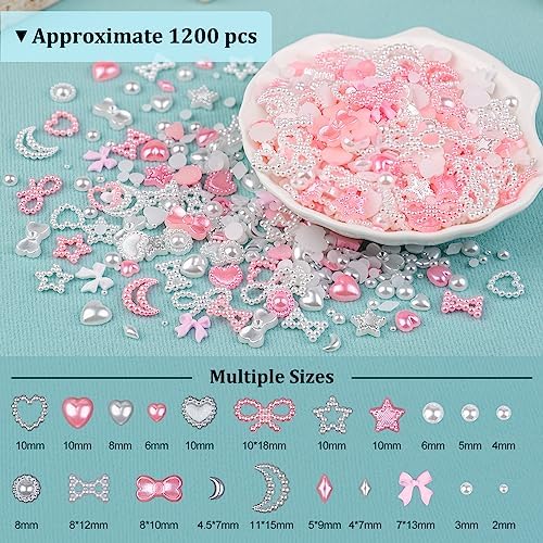 1200Pcs 3D Multi Shapes Nail Charms and Flatback Pearls, White&Pink Mix Styles Heart Star Bow Sunflower Embellishments for Nail Art, Craft and Decoration with Tweezer and Pickup Pencil