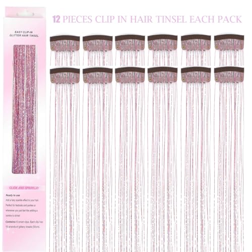 12Pcs Hair Tinsel Clip in 20Inch Fairy Hair Clip in Hair Tinsel Kit Heat Resistant,Pink Clip in Hair Tinsel Extensions Glitter Hair Tensile Clip in Sparkly Hair Accessories for Women Girls Kids (Pink)