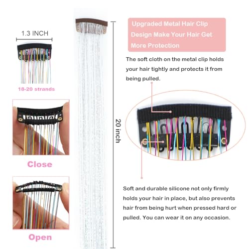 【High quality glitter hair extensions】:Clip in tinsel hair extensions are made of 100% durable polyester fiber . No bad smell, non toxic,Shining with a shining light light and super smooth. Silk Feeling, no tangles,no shedding.The hair tinsel clip in measures 20 inch long ,enough to cut to different length according to your hair extension requirements.