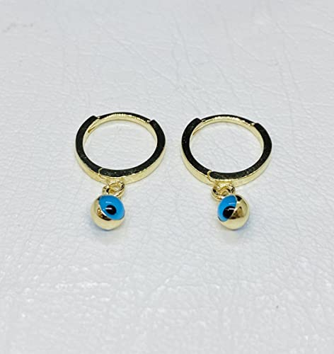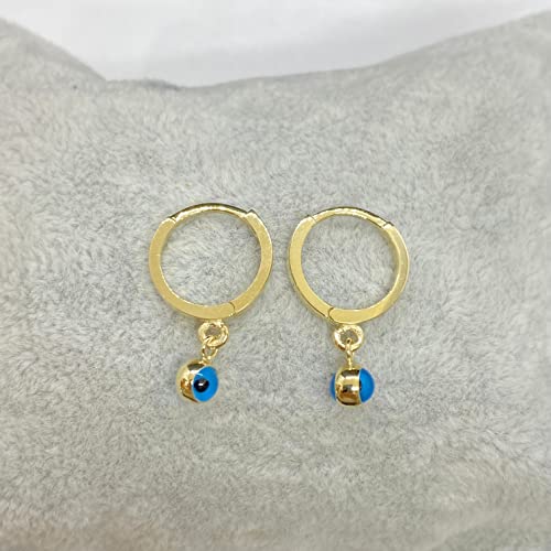 14K Real Solid Gold Two Sided Evil Eye Dangle Drop Hoops Earrings for Kids Teen Girls, Nazar Jewelry for Baby, Birthday Gift for Baby Girl