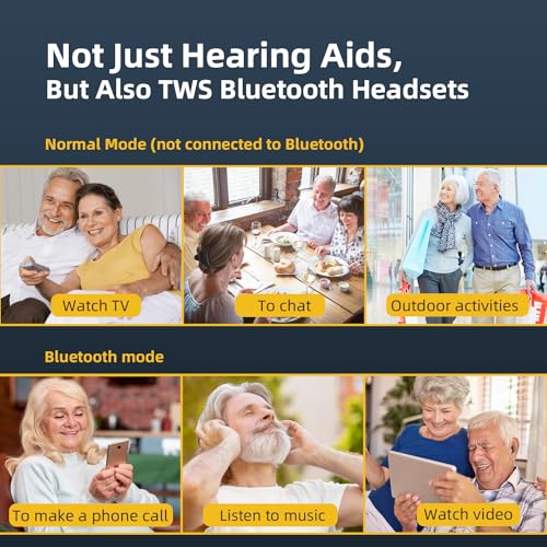 【Upgraded,16 Channel Smart Chip】: Our bluetooth hearing aids rechargeable combine with professional-grade headphone processing technology.Provides 45 dB hearing compensation and experience crystal clear sound.Not only does it have a comprehensive noise reduction function, it is also configured with 3 different modes, allowing you to easily receive clear sounds through bluetooth hearing aids rechargeable indoors, outdoors, and in strong noise environments.