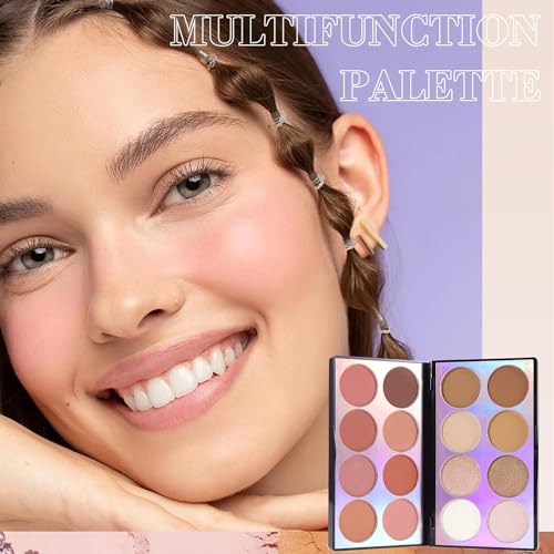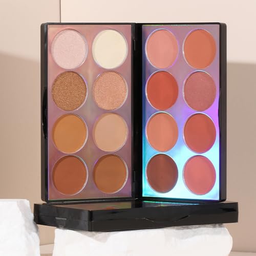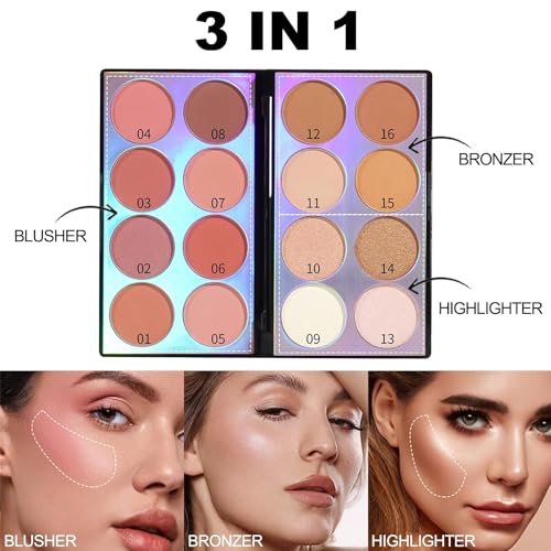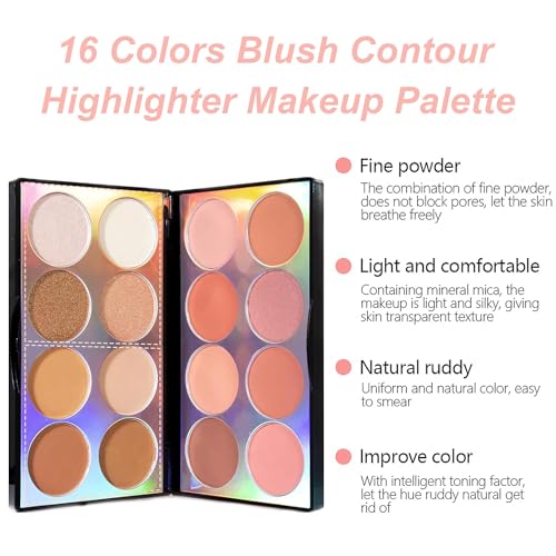 16 Colors Blush Contour Highlighter Makeup Palette, All in One Shimmer Matte Blush Powder Makeup Palette, Face Sculpting Bronzer Blusher Illuminator Palette with a Natural Facial Glowing