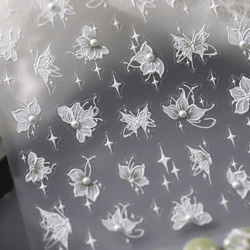 1Pcs White Flower Nail Art Stickers Decals 5D Embossed Diamond Flower Nail Decals Self Adhesive Pearls Floral Nail Design Nail Supplies Nail Accessories for DIY Manicure Nail Art Decorations