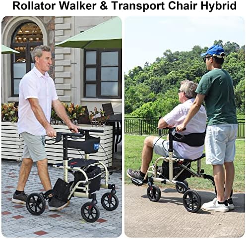 2 in 1 Rollator Walker Transport Chair for Seniors, 10” Wheels Medical Rollator for Seniors with Widen Seat Backrest, Detachable & Adjustable Footrests Folding Walker Wheelchair Combo, Gold