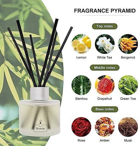 [ Two Packs Reed Diffuser] Opening the exquisite aromatherapy reed diffuser box, you can get: 2 pieces natural bamboo and white tea essential oil (3.4 ounces/ 100ml), black thick volatile rods (8 pcs) x2, dreamy and charming frosted glass decorative bottles.