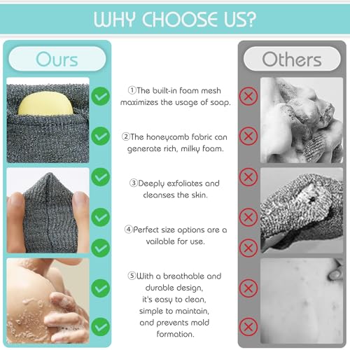 DEEP EXFOLIATION: The deep exfoliating soap saver pouch (available in two convenient sizes – 4.4in x 4.4in and 4.4in x 7.8in) and dual-textured washcloth(sizes – 8.66in x 8.66in ) work together to gently remove dead skin cells and deeply cleanse your body for smooth, refreshed skin. To get the most out of the exfoliating soap saver pouch, be sure to soak it in water before use.