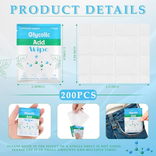200 Pcs Glycolic Acid 20% Exfoliating Facial Pads Individual Wrapped Bulk Face Body Cleansing Wipes Single Step Pads Exfoliating Wrinkles Resurfacing Pads Travel