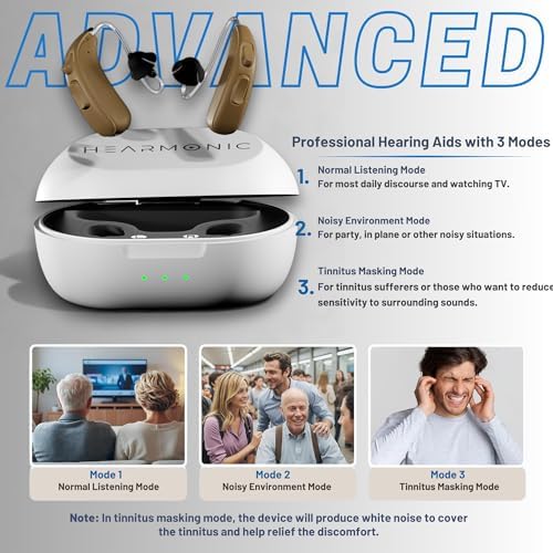 [Professional Hearing Modes] Hearmonic J337-RIC (reciver in canal) which is a much more sophisticated way of handling sound frequencies, as compared to BTE (Behind the ear) type hearing aids. Professional hearing aids for various scenes. Quite mode for normal environment to hear every tiny sound, noisy mode for noisy environment with background reduction to focus on human voice. These two modes can satisfy all the situation you would need. And since many people with hearing loss might also have tinnitus, Hearmonic J337-RIC provides the tinnitus masking mode to relief the tinnitus problem.