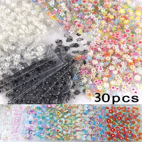 30 Sheets Flower Nail Stickers 3D Self-Adhesive Black White Colorful Cherry Blossoms Daisy Flower Nail Art Stickers for Gel Nails Spring Flower Nail Design Supplies Women DIY Nail Charms Decoration