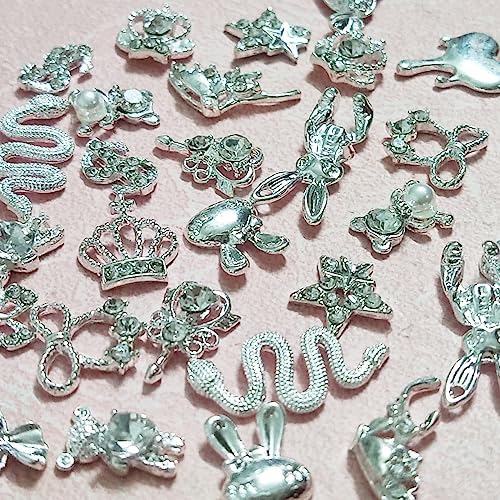 30Pcs Luxury Silver Nail Charms Shiny Pearl Alloy Nail Rhinestones Butterfly Heart Star Nail Charms Metal Snake Flower Nail Art Charm Nail Gems for Nails Women Acrylic Nail Jewels Nail Art Decorations
