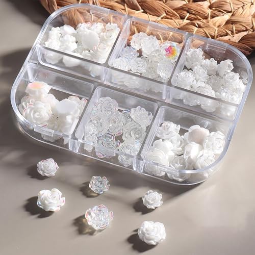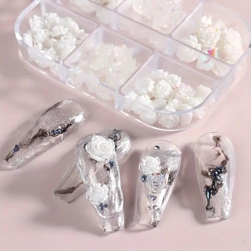 3D Flower Charms for Nails, Flowers Nail Art Charms 6 Grids Resin Rose Nail Designs Accessories White Aurora Floral Nail Art Rhinestones Cute Nail Jewelry for Women Girls DIY Nail Art Decorations