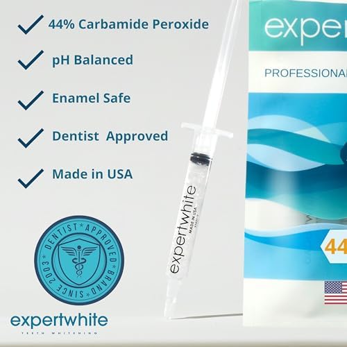 Expertwhite Carbamide Teeth Whitening Gels are Made in the USA and dentist-approved (and used) for 20 years. Now direct to you. Refill Teeth whiteing syringes Kit (1 Pack / 4 Count) Carbamide Peroxide. Mint Flavor. Tooth Whitening Refills. It is one of our most popular teeth whitening bleaching gels for tray whitening because it only requires 15 minutes of wear time in trays. This is for people who do not have tooth sensitivity. Apply tooth whitener gel to the tray, whiten for 15 minutes, and reveal the whitest teeth. Carbamide Peroxide bleaching gel for trays will keep your teeth white and your smile bright. Expertwhite is formulated in California, is Dentist-approved, and has been used for 20 years.