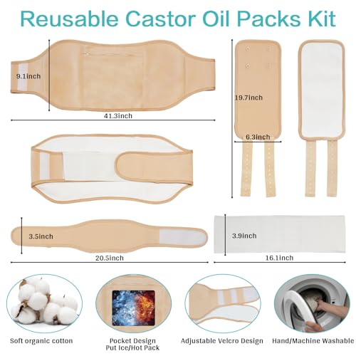 Castor Oil Wrap Kit: The package have 5 pcs sets and include 2 pcs knee castor oil packs, 1 pcs waist castor oil packs, 1 pcs neck castor oil wrap, and 1 pcs extension belt. One castor oil packs kit can cater to different body parts, you can use them on the arms, knee, legs, stomach, belly, waist, relaxing the entire body (Castor Oil Not Include).