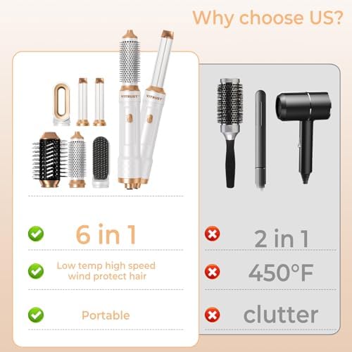 【Unique Design Hair Styling tools】6 in 1 hair styler set combines a hair dryer with the popular Hot Air Brush Head design, You can pair it with different brush heads to create on-trend looks. It has a unique oval design that helps smooth hair and prevent tangles. The handle of this hairdryer brush it is ergonomic and easy to grip with a 360 degree rotatable power cord, allowing you to make it easy and comfortable to use.