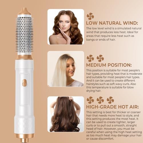 【6 IN 1 Styling Tools & Appliances】This 6 in 1 brush blow dryer kit includes 1*hair dryer, 1*straightening brush, 2*left right hair curlers, 1* thermal brush for straightening and volumizing, 1*Massage hot brush. left hair curler: put the hair tail on the curling iron from the left direction, and then hair will be absorbed on it, right curler is opposite operation. This 6 in 1 hot air brush kit meet all your different needs.Note: Children please use under the supervision of parents.
