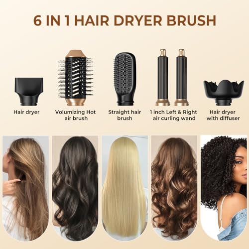 6 in 1 Hair Dryer Brush, Air Curler for Hair Styler Curling Wand, Negative Ionic Foldable Hair Dryer with Diffuser, Hot Air Brush Volumizer, Thermal Brush, Hair Dryer Brush Hair Styling Tools