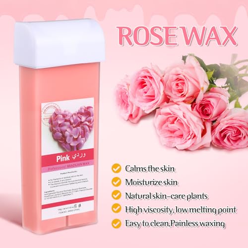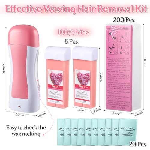 6 Pack Roll on Wax Refill Roll on Wax Kit for Hair Removal with Roll on Wax Warmer, 200 Wax Strips and 20 Clean Oil Bag Roller Wax Kit Waxing Kit for Women Men(Rose)