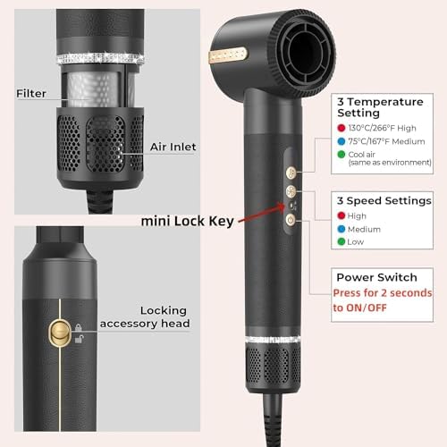 【131℉-266℉/3 WIND SPEED SETTING】 ➤ LOW: Low Temperature 131℉, HIGH WIND SPEED, for dry hair / fine hair, Suitable for summer use.➤ MIDDLE: Medium Temperature 167℉, LOW WIND SPEED, for semi-dry hair / normal hair, Suitable for styling. ➤ HIGH: High Temperature 266℉, HIGH WIND SPEED for wet hair / thick and curly hair, Suitable for winter use, dry hair quickly. ➤ Meet All Your Style Needs, be the most shining queen.