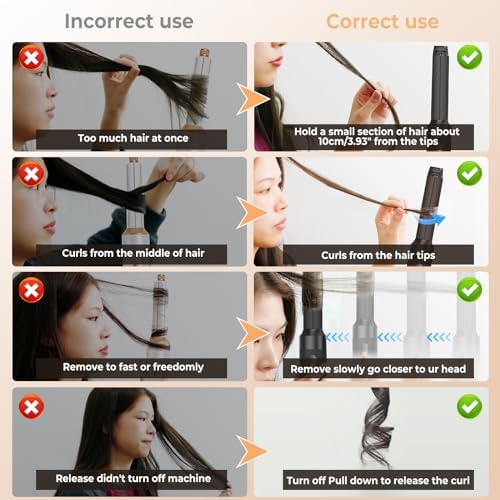 【 Tips for using a hot air curler 】 1.Hold a small section of hair about 10cm/3.93″ from the tips. 2.Bring the hair toward the barrel,hair will begin to wrap. 3.Must be Start wrap from the hair tips. 4.Create tension and bring towards your head. 5.Hold in place for 15s or until dry. 6. Turn off and release. The usage of hot air curling sticks is different from the regular curling sticks. If you are confused during use, please contact us and we will provide you with professional service support