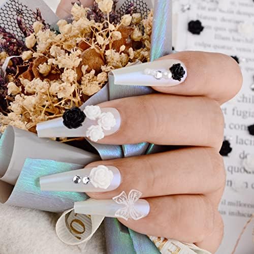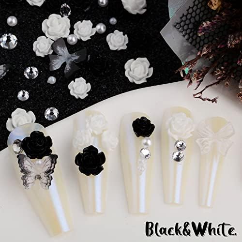 Different Styles in Package:: You will get more than 100pcs 3D nail design decorations:100pcs mixed black&white camellia rose flower butterfly bow bowknot nail charms with round pearls beads gems and flatback white nail rhinestones.