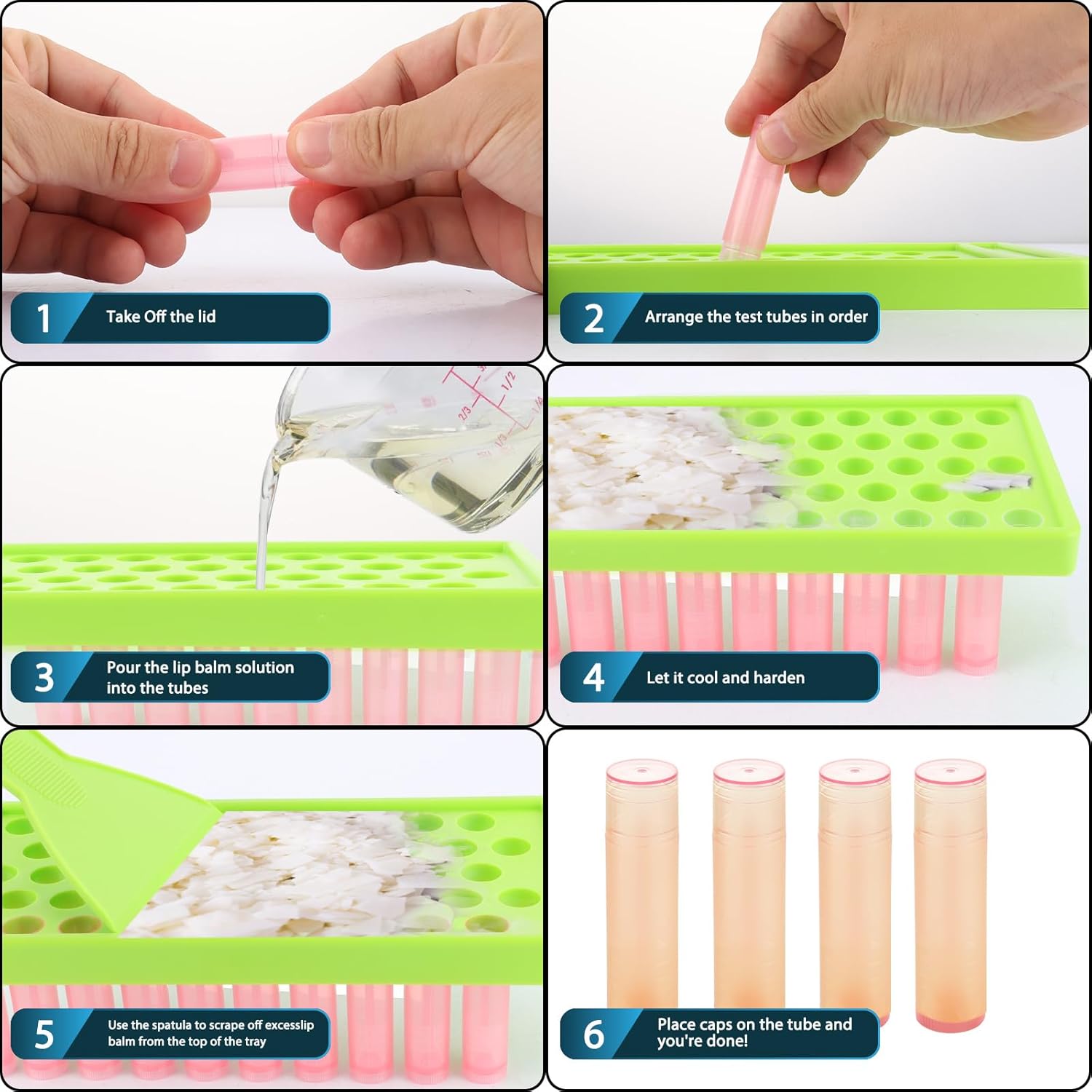 👍Easy to Use – Simply insert all 100 empty Lip balm tubes into the filling tray in batches, fill the tubes, and let them cool and dry; use the spatula to scrape off the excess lip balm from the top of the tray.