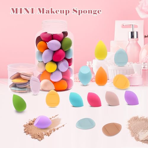 ⏭【Package Includes】40P mini makeup sponges (2 styles and random colors) and 10P finger mini powder puffs, with 2 plastic storage bottles, perfect for carrying and keeping makeup tools clean.