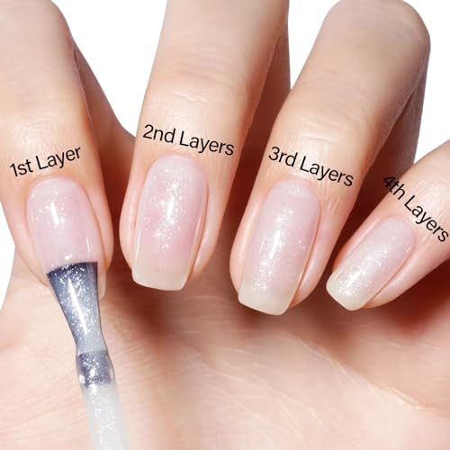 EACH LAYER IS DIFFERENT EFFECT – Sheer translucent gel polish has a light color ,applying thinly allows the color to become more even. Most importantly, its effect depends on your nail base color and the number of layers you apply ,the more coats you apply, the more visible the sparkle and color will be.