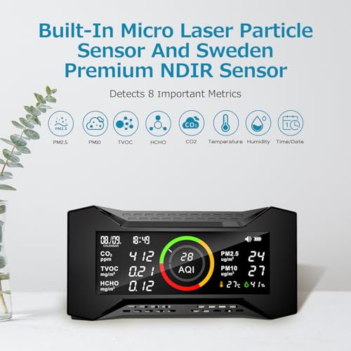 Air-Guardian AQ Air Quality Monitor, Indoor CO2 Monitor (PM2.5, PM10, CO2, VOC, Formaldehyde, Humidity, Temp) Multifunctional air Pollution Detector, Easy Calibration Indoor Air Quality Meter