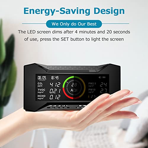 NO complicated settings, ready to use when turned on. The clear LED screen display shows the colorful bar of AQI, and also the alarm buzzer can be turned off at any time. All improvements are for better customer service.