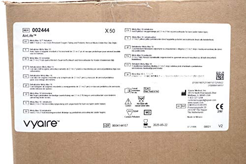 The Vyaire Medical AirLife Misty Max 10 Nebulizer fits virtually all common masks and adapters, all oxygen tubing is crush resistant recommended for single patient use. Features one-piece jet design that delivers efficient, high output rates, resulting in faster treatment times and consistent medication delivery. Includes pediatric aerosol mask and 7′ oxygen tubing with blue rigid tip. The medical product comes in a case of 50.