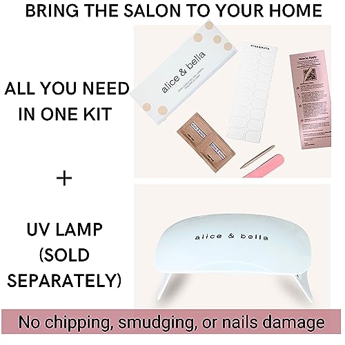 FORGET MESSY & HARMFUL NAIL PRODUCTS: Apply our nail treatment formula effortlessly, like a sticker, and watch it quickly cure to a strong gel-like finish. No prior experience is required. Enjoy water-resistant nails that withstand regular daily activities, including water sports. A UV lamp is required for a quick 1-minute cure. Consider the Alice & Bella Mini UV lamp that limits UV exposure to your hands.