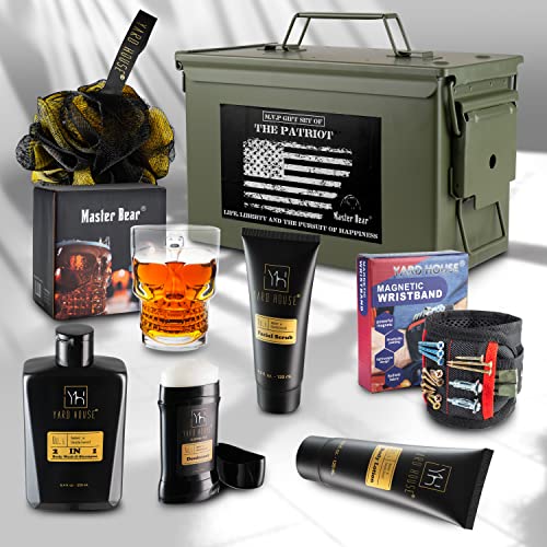 THE ULTIMATE AMMO CAN GIFT SET. Surprise the special man in your life with our 8-Pc authentic 50 Cal Steel Ammo Case Gift Set including: beer mug, magnetic wristband, 2-in-1 body wash and shampoo; body lotion; facial scrub; deodorant bar; shower puff