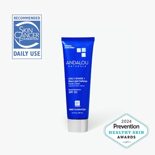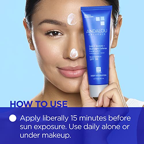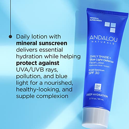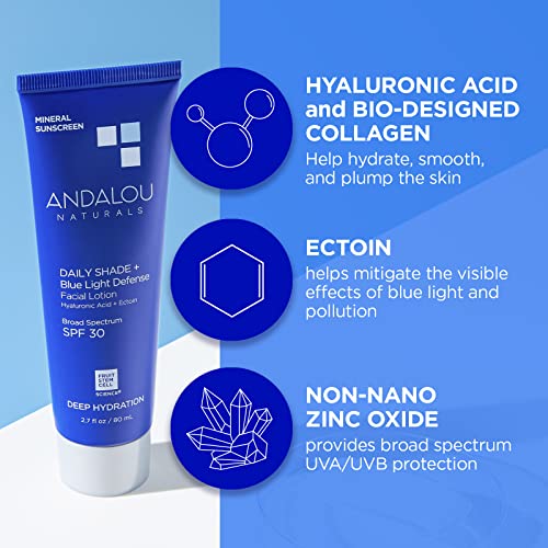 Andalou Naturals Face Sunscreen, SPF 30 Daily Shade + Blue Light Defense Facial Lotion, Broad Spectrum Protection, Deeply Hydrating Mineral Sun Block with Hyaluronic Acid & Zinc Oxide, 2.7 Fl Oz