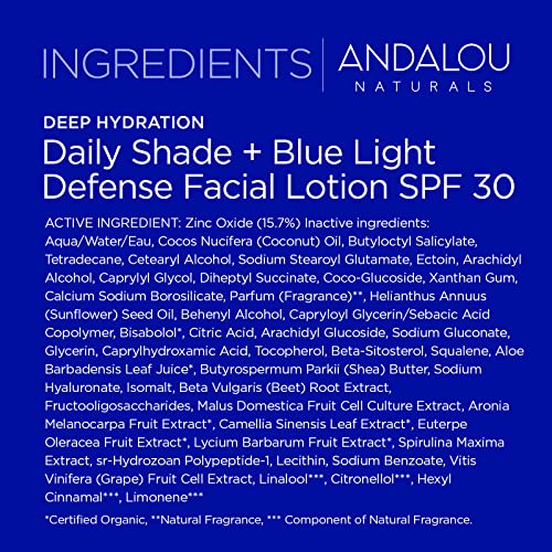 Andalou Naturals Deep Hydration Daily Shade + Blue Light Defense SPF 30 Facial Lotion Andalou Naturals Daily Shade + Blue Light Defense SPF Lotion is a mineral sunscreen that delivers essential hydration while helping protect against multiple everyday aggressors such as UVA/UVB rays, pollution and blue light oxidative stress, for a more nourished, healthy-looking and supple complexion. Formulated with Hyaluronic Acid and Bio-Designed Collagen to help hydrate, smooth and plump the skin. Ectoin helps mitigate the visible effects of blue light and pollution. The Non-Nano Zinc Oxide provides broad spectrum UVA/UVB protection. Our Mineral SPF helps reduce collagen depletion while providing ultra-hydrating benefits to reveal plumper, healthier-looking skin. The gentle, lightweight sunscreen absorbs right into the skin and is dermatologically tested and recommended for daily use. Fruit Stem Cell Science is our signature innovation for skin care products to protect and support healthy skin. Our products feature only ingredients that are organic, gluten-free, sustainable, cruelty-free and nature-derived. Non-GMO remains a core brand value of Andalou Naturals and we continue to source superior non-GMO ingredients for our products.