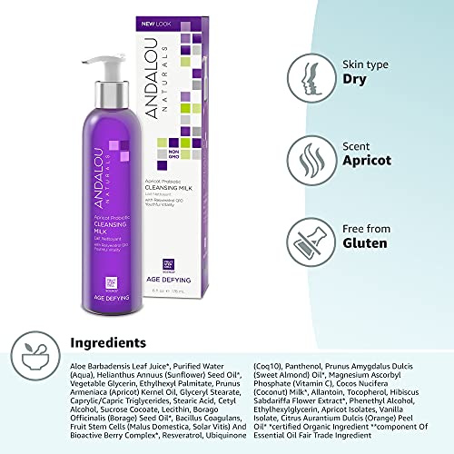 FACIAL CLEANSER FOR DEHYDRATED SKIN: Andalou Naturals Apricot Probiotic Cleansing Milk is a gentle cleanser using probiotics & resveratrol CoQ10, blended with apricot & borage oils, to gently cleanse makeup & impurities without stripping away moisture