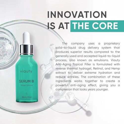 ✅ Innovation- the company uses a proprietary solid-to-liquid drug delivery system that produces superior results compared to the liquid-to-liquid process, also known as emulsions. Viauty Anti-Aging Topical Filler is formulated with reverse thermal hydrogel, Retinol, and Hemp extract to deliver extreme hydration