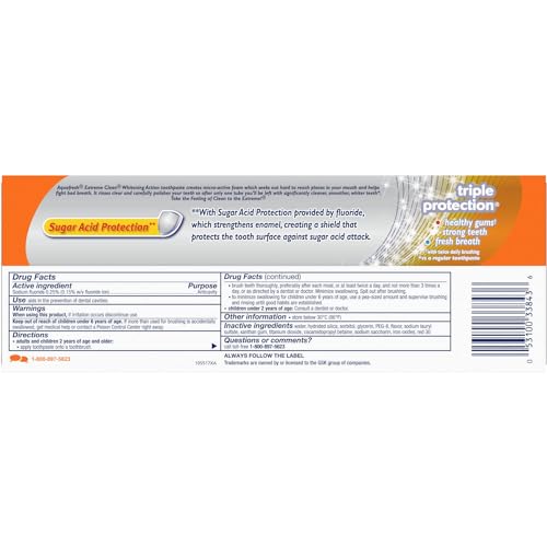 EXTREME CLEAN WITH MICRO-ACTIVE FOAMING ACTION + WHITENING whitening action Sugar Acid Protection** from Fluoride mint blast helps restore natural whiteness triple protection healthy gums strong teeth fresh breath with twice daily brushing *vs. a regular toothpaste Aquafresh Extreme Clean Whitening Action toothpaste creates micro-active foam which seeks out hard to reach places in your mouth and helps fight bad breath. It rinses clear and carefully polishes your teeth so after only one tube you will be left with significantly cleaner, smoother, whiter teeth*. Take the Feeling of Clean to the Extreme! **With Sugar Acid Protection provided by fluoride, which strengthens enamel, creating a shield that protects the tooth surface against sugar acid attack.