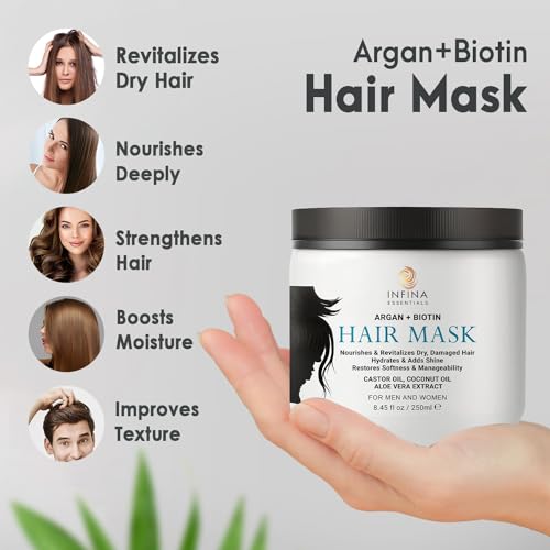 Argan Oil Hair Mask with Biotin – Intensive Hydrating Treatment & Deep Conditioning for Dry, Damaged Hair, Encourages Hair Growth – All Hair Types, Men & Women – 8.45 fl oz