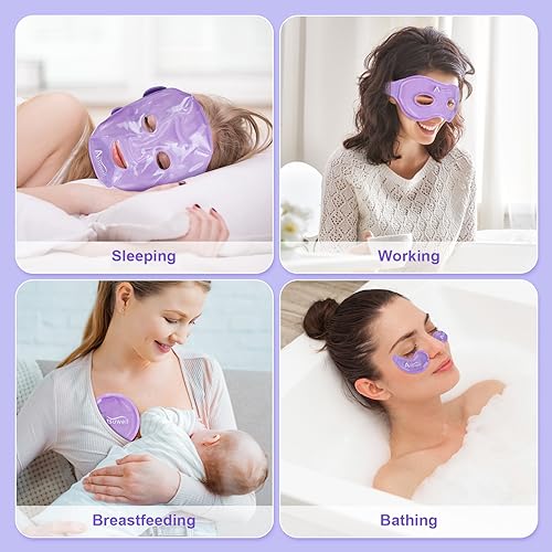 7-in-1 Piece Reusable Cooling Face Mask Set – The combo includes 1 x ice mask for face, 1 x ice eye mask for puffy eyes, 2 x cooling under eye pads, 2 x gel ice pack, 1 x storage carry bag.The gel face mask kit is specifically designed for people who want to relieve facial and eye pain, fatigue after work and travel, or use it as a basic daily skin care. Just chill the storage bag containing gel mask in the freezer for 3 hours before use, then enjoy up to 10 mins soothing cold therapy.