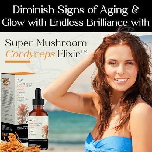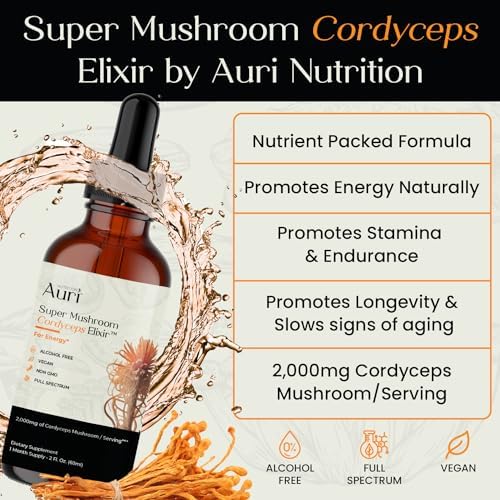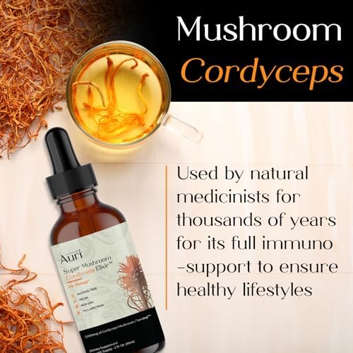 Auri Super Mushroom Cordyceps Elixir for Stamina, Natural Energy, Youthfulness and Longevity with Full Spectrum Support – 60 ml