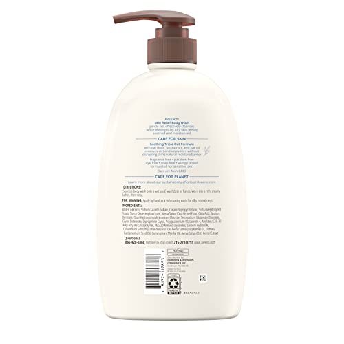Gently cleanse while leaving itchy, dry skin feeling moisturized with Aveeno Skin Relief Fragrance-Free Body Wash. This sulfate free body wash is made with a soothing Triple Oat formula and formulated for sensitive skin. Aveeno Skin Relief Body Wash gently, but effectively cleanses while leaving itchy, dry skin feeling soothed and feeling moisturized. 91% of users agreed the skin relief body wash gently cleansed their skin without drying it out. From the dermatologist-recommended brand for over 70 years, this body wash is allergy-tested, free of fragrances, sulfates, parabens, dyes, and soaps, and is suitable for daily use. To use, squeeze body wash onto a wet pouf, washcloth, or hands. Work into a rich, creamy lather, then rinse. Use the creamy body wash as a rich shave gel for silky, smooth legs. Follow with Aveeno Skin Relief Moisturizing Lotion to lock in moisture for 24 hours as a part of your daily skincare routine.