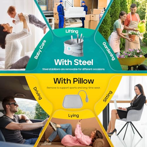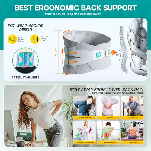 Back Brace for Lower Back Pain Relief, 4-in-1 Lumbar Support Belt for Men & Women, 3D Knit Breathable Design with Inflatable Back Pillow for Home, Office, Work and Workout (Grey, Large)