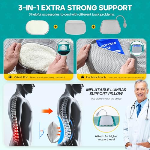 🔥4-IN-1 BACK BELT KIT – To address various lumbar issues, this lower back support brace set includes an inflatable lumbar pillow for stronger support, a velvet pad to keep your belly and back warm, and a mesh pouch that can put ice pack inside for hot or cold therapy (ice pack not included). Whether you’re suffering from pain or recovering from an injury, this lumbar support belt provides different intensity levels of support to meet your needs.